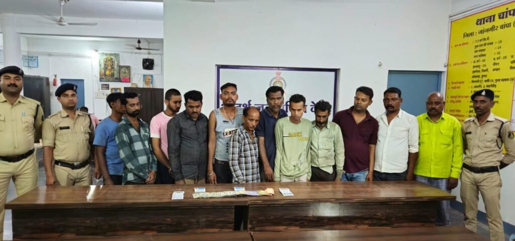 आरोपियों के कब्जे से 52 पत्ती तास, नगदी रकम 22900/रूपये, को किया बरामद श्री विवेक शुक्ला (IPS) वरिष्ठ पुलिस अधीक्षक जांजगीर चांपा* के दिशा निर्देशन एवं *अतिरिक्त पुलिस अधीक्षक श्री उमेश कुमार कश्यप* के कुशल मार्गदर्शन पर क्षेत्र में शांति और सुरक्षा बनाए रखने के लिए जांजगीर पुलिस द्वारा सख्त कदम उठाए जा रहे हैं। इसी कड़ी में *SDOP चाम्पा श्री यदुमणि सिदार* के मार्ग दर्शन में दिनांक 28.03.25 को मुखबिर सूचना मिला कि थाना चांपा क्षेत्र के ग्राम सिवनी मे तालाब के पास बिजली खंभा के नीचे कुछ लोग रुपए पैसे का दांव लगाकर जुआ खेल रहे हैं की सूचना पर निरीक्षक जय प्रकाश गुप्ता थाना प्रभारी चांपा के नेतृत्व में थाना चांपा टीम द्वारा रेड कार्यवाही कर 12 जुवाड़ीयानो को जुआ खेलते पकड़ा गया जुवाड़ीयानो से कुल 22900/- तथा ताश पत्ती जप्त किया गया, सभी जुवाड़ीयानो को विधिवत गिरफ्तार कर आरोपियों के विरुद्ध छ. ग. जुआ प्रतिषेध अधिनियम 2022 की धारा 3(2) के तहत कार्यवाही किया गया।