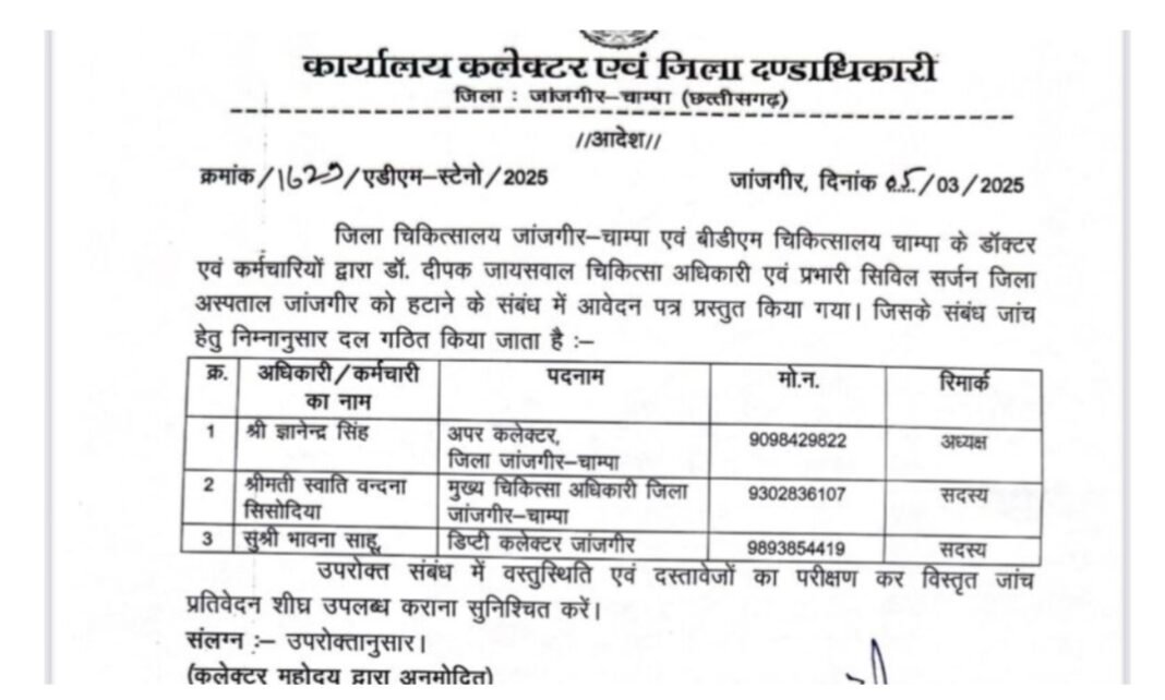 जांजगीर-चांपा 05 मार्च 2025/ जिला चिकित्सालय एवं बीडीएम चिकित्सालय चांपा के डॉक्टर एवं कर्मचारियों द्वारा डॉ दीपक जायसवाल चिकित्सा अधिकारी एवं प्रभारी सिविल सर्जन जिला अस्पताल जांजगीर को हटाने के संबंध में आवेदन पत्र प्रस्तुत किया गया है। कलेक्टर कार्यालय जांजगीर-चांपा से जारी पत्र के अनुसार प्रभारी सिविल सर्जन के विरूद्ध शिकायत के जांच हेतु तीन सदस्यीय दल गठित किया गया है। गठित दल में अपर कलेक्टर श्री ज्ञानेन्द्र सिंह अध्यक्ष, मुख्य चिकित्सा एवं स्वास्थ्य अधिकारी श्रीमती स्वाति वंदना सिसोदिया एवं डिप्टी कलेक्टर सुश्री भावना साहू को सदस्य बनाया गया है। जांच दल द्वारा मामले की वस्तु स्थिति एवं दस्तावेजों का परीक्षण कर विस्तृत जांच करते हुए प्रतिवेदन तैयार किया जाएगा।