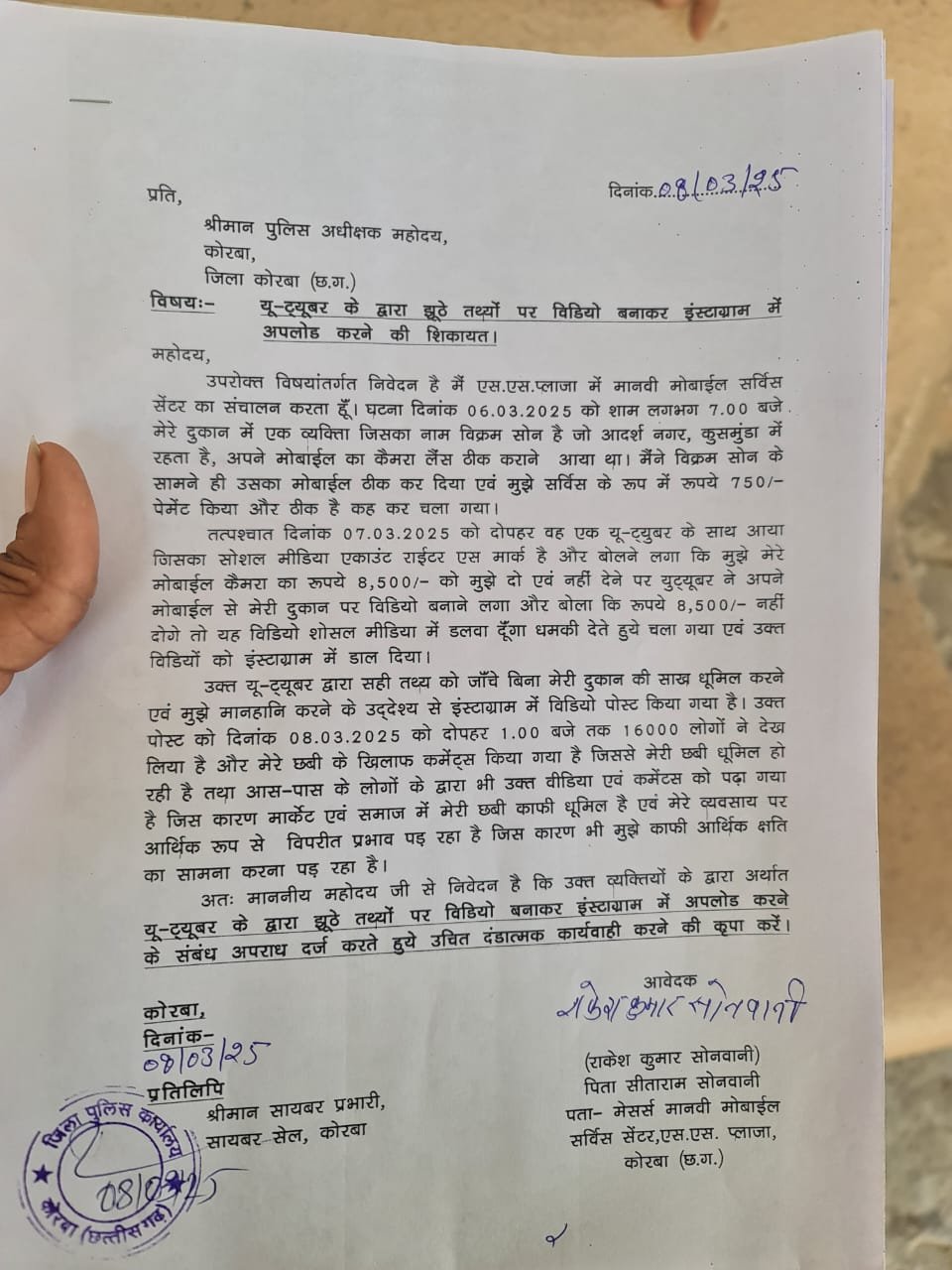 AS NEWS 24 कोरबा – कोरबा जिला के कोतवाली थानांतर्गत एस. एस. प्लाजा स्थित एक मोबाईल दुकान संचालक से एक यू-ट्यूबर ने पैसे ऐंठने के उदेश्य से झूठा दावा यू-ट्यूब में अपलोड कर दिया। मामले से क्षुब्द होकर मानवी मोबाईल दुकान संचालक राकेश कुमार सोनवानी ने पुलिस अधीक्षक कोरबा एवं साइबर सेल कोरबा से मामले की शिकायत की है। मामला यह है कि दिनांक 06 मार्च 2025 को विक्रम सोन नाम का ग्राहक अपने मोबाईल में कैमरा लेंश का ग्लास लगवाने आया था जिसे दुकानदार ने लगाकर ग्राहक को वापस कर दिया। ग्राहक ने मोबाईल चेक करके वापस अपने घर चला गया जिसके बाद दूसरे दिन वह दोपहर में यू-ट्यूबर के साथ आया और मोबाईल कैमरा खराब कर देने का आरोप लगाने लगा और दुकानदार से 8,500 रूपये की डिमान्ड करने लगा। दूकान ने इसका विरोध किया तो यू-ट्यूबर द्वारा विडियों बनाकर अपलोड करने की धमकी दी और बाद में पैसे नहीं देने पर बिना तथ्यों को पूरा जाने और झूठा आरोप लगाकर विडियों अपने इन्टाग्राम आईडी rider somet [rider_s_mark] पर अपलोड कर दिया। विडियों अपलोड होते ही कुछ ही घंटो में हजारों लोगों ने देखा और उस विडियों में दुकानदार के खिलाफ कई अपशब्द वाक्य और व्यवसाय की छबी को धुमिल करने वाले कमेन्टस आने लगे। जिससे दुकानदार की छबी धुमिल हो गई और दूकानदार ने क्षुब्द होकर मामले की शिकायत पुलिस अधिक्षक कोरबा एवं साइबार सेल प्रभारी से कर कार्यवाही की मांग की है।